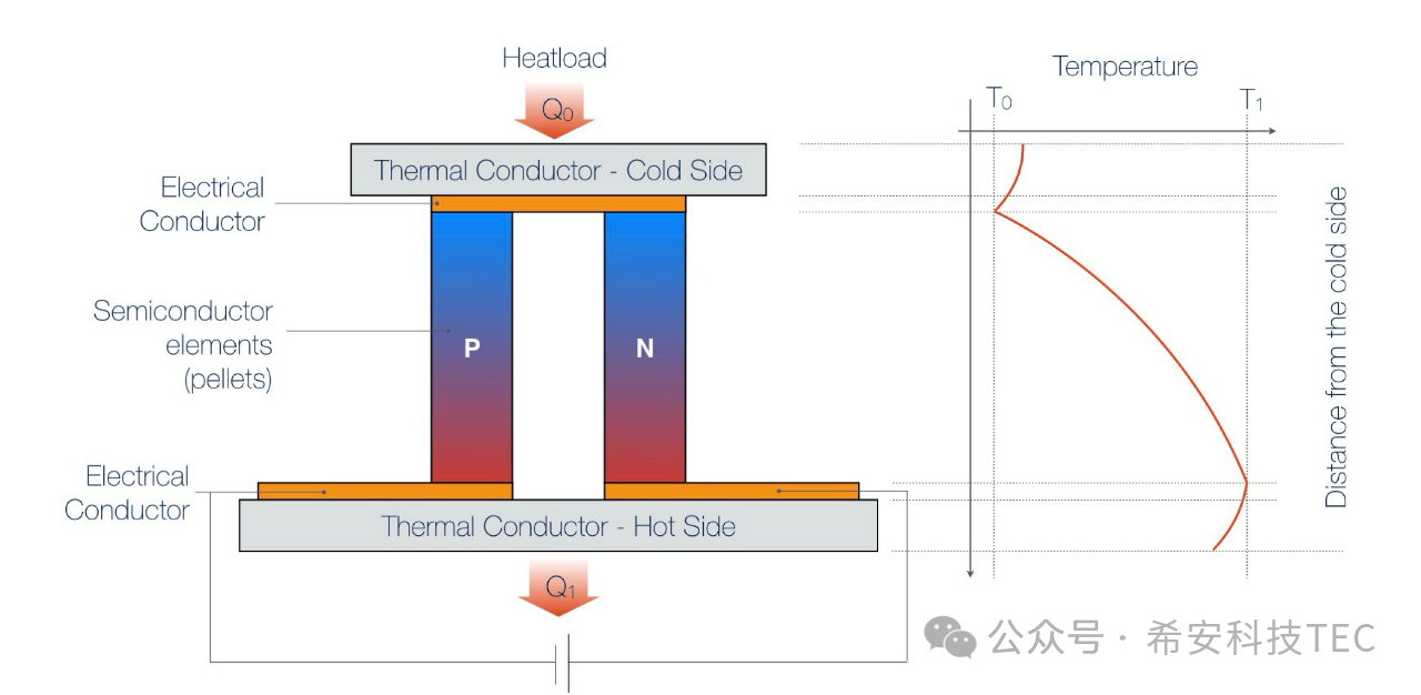 Khi dòng điện một chiều đi qua cặp nhiệt điện, các hạt bán dẫn loại P và loại N (loại P (được pha tạp các nguyên tố hóa trị ba như boron, có lỗ) dẫn điện qua các lỗ và trở nên tích điện dương; Một cặp hạt bán dẫn loại N (được pha tạp các nguyên tố hóa trị năm như phốt pho) dẫn điện bằng electron và mang điện tích âm.